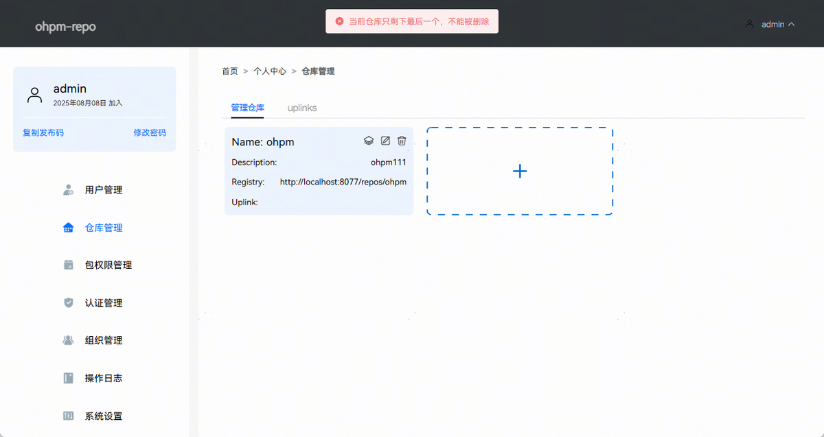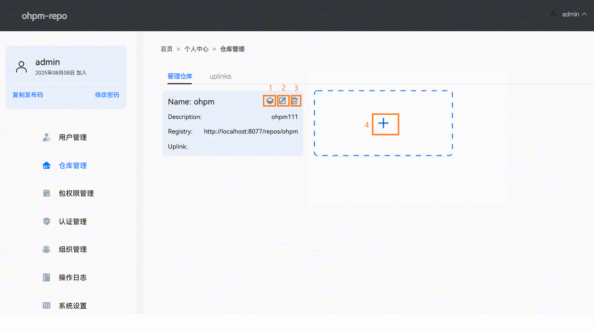 仓库管理主要负责管理仓库信息,包括仓库中所有包权限管理,包的上传与下架和uplinks管理。
