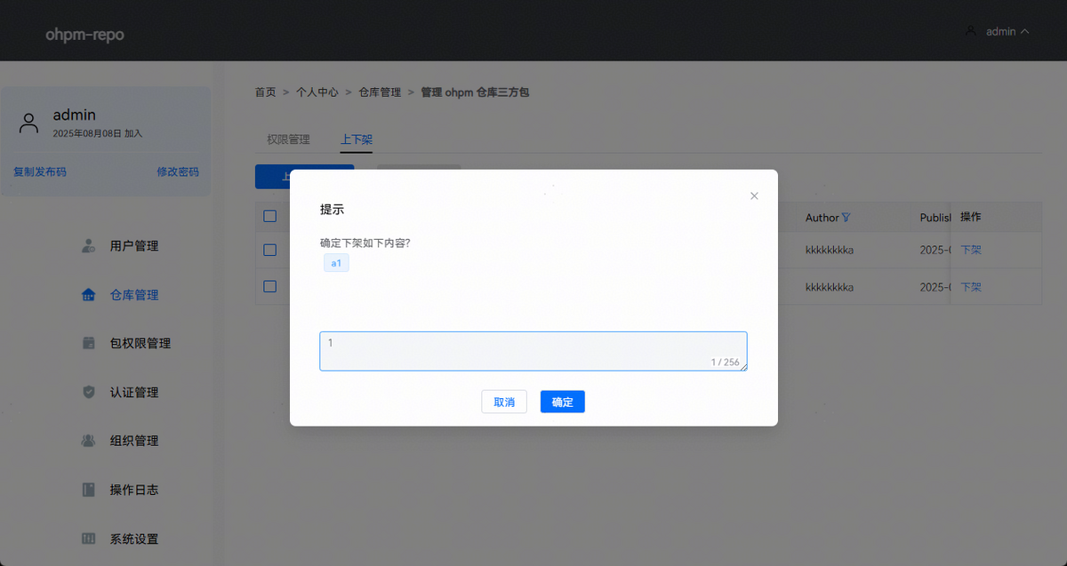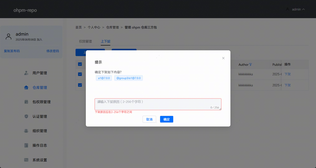 区域2:下架,点击指定包右边的“下架”按钮,进行单个包下架操作,输入下架原因即可完成包的下架,页面效果如下图所示: