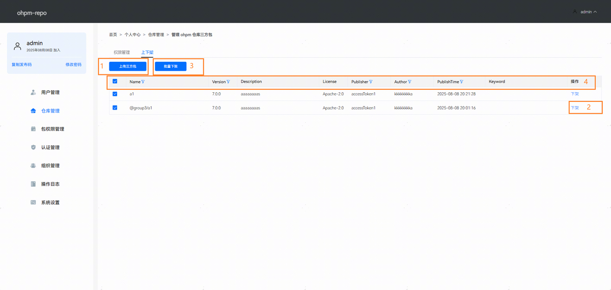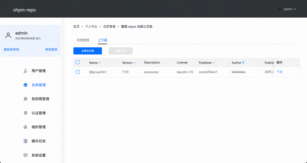 点击“管理ohpm仓库三方包”按钮,进入仓库管理详情面板,展示所有已上传至ohpm-repo的三方包信息。上下架包含上传三方包、单个包下架、批量包下架和搜索三方包四个功能。
