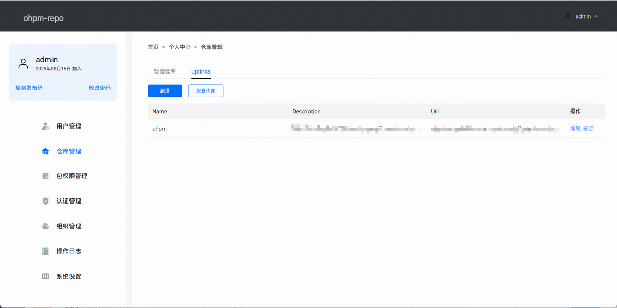 点击新增按钮,可以创建新的uplink仓库。一旦完成新增uplink仓库的设置,必须前往仓库管理 > 管理仓库 > 编辑页面进行应用,这样该功能才会生效,且ohpm-repo只允许同时配置一个uplink仓库。uplink仓库地址不建议配置为其他ohpm-repo的地址,避免出现仓库A配置uplink为仓库B,仓库B配置uplink为仓库A,导致循环查找问题。页面效果如下图所示: