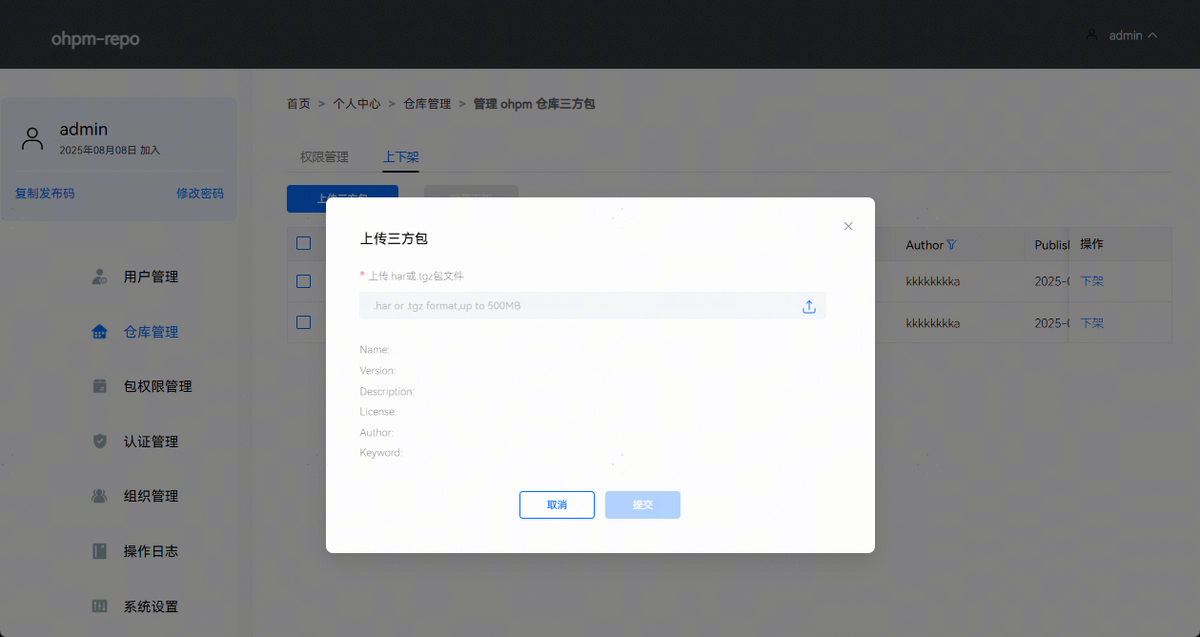 管理三方包页面包含权限管理和上下架两部分。