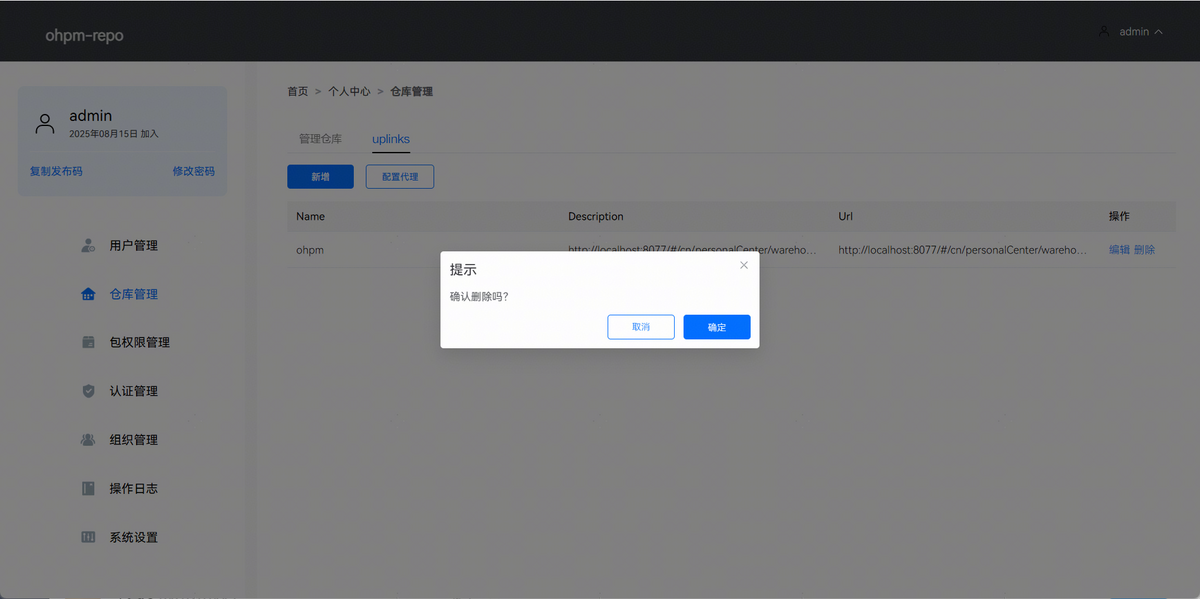 点击删除,可以删除配置的uplink仓库,页面效果如下图所示: