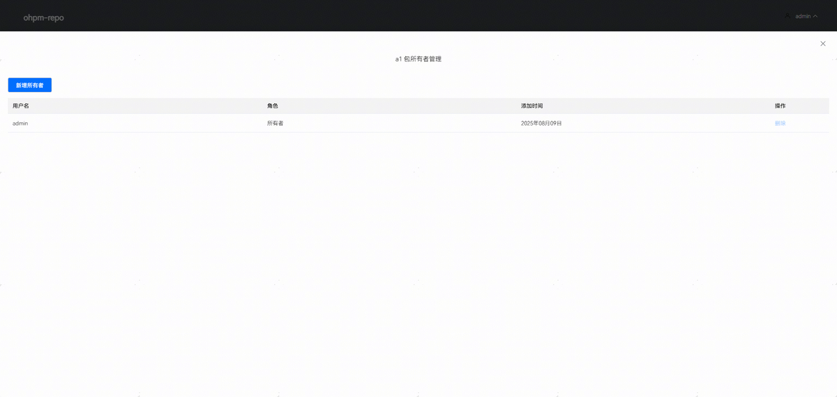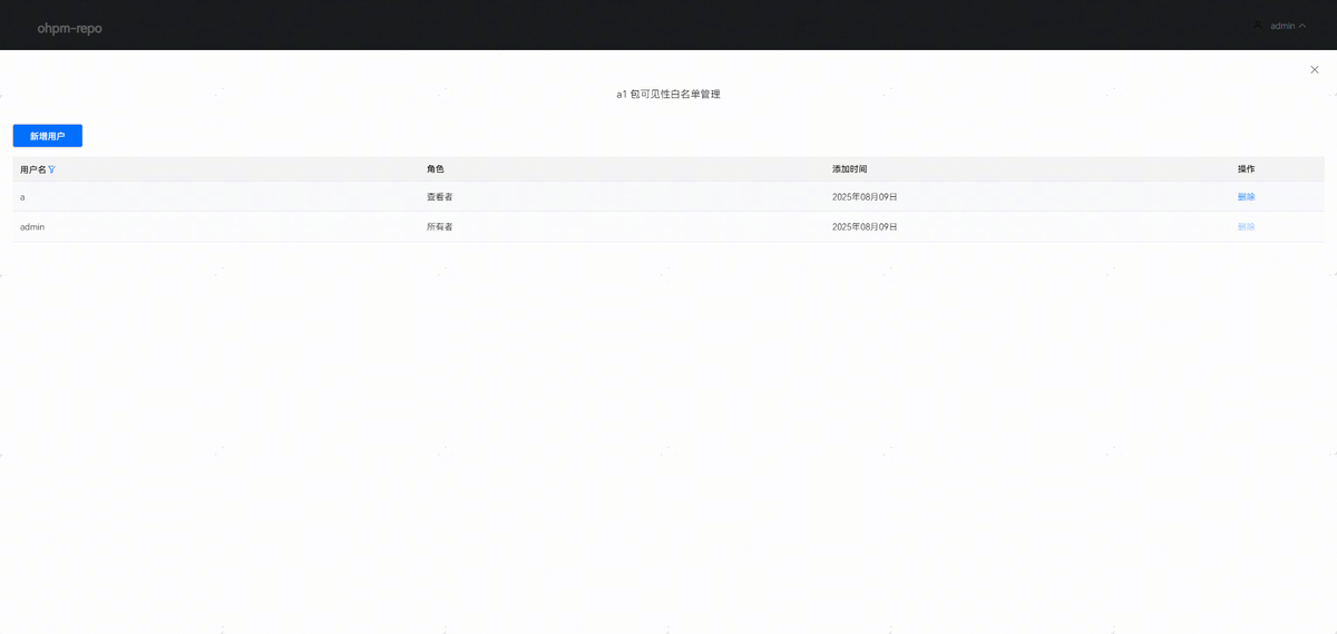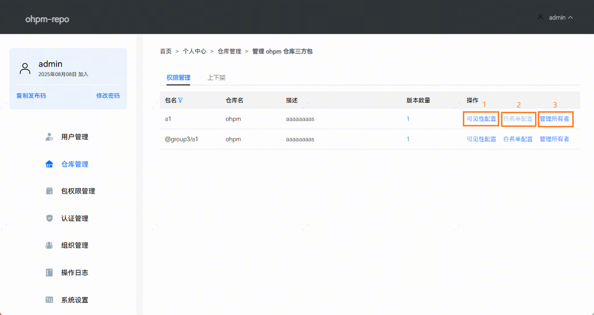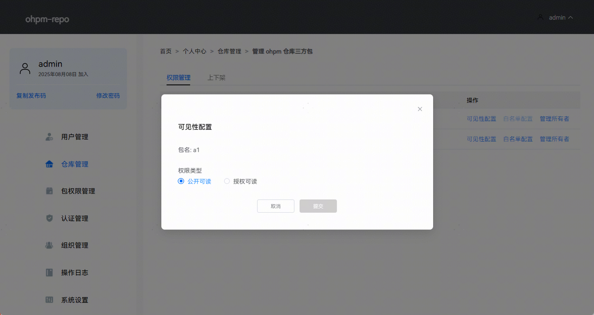ohpm-repo从5.3.0版本开始支持配置包级别的访问权限。系统管理员能够对仓库中所有的包进行权限管理,支持配置包的可见性、白名单和管理所有者。支持通过包名模糊检索到需要管理权限的包。