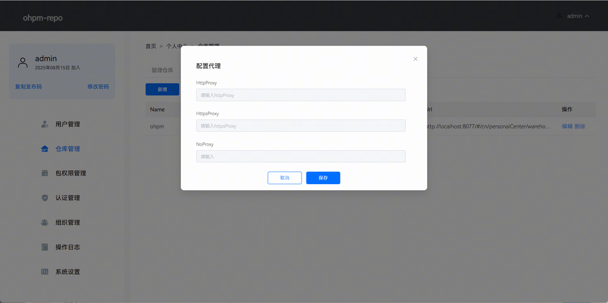 由于搭建的ohpm-repo私仓可能需要通过代理来访问已配置的uplink仓库,因此ohpm-repo提供了代理功能。点击配置代理,可以添加代理信息,页面效果如下图所示: