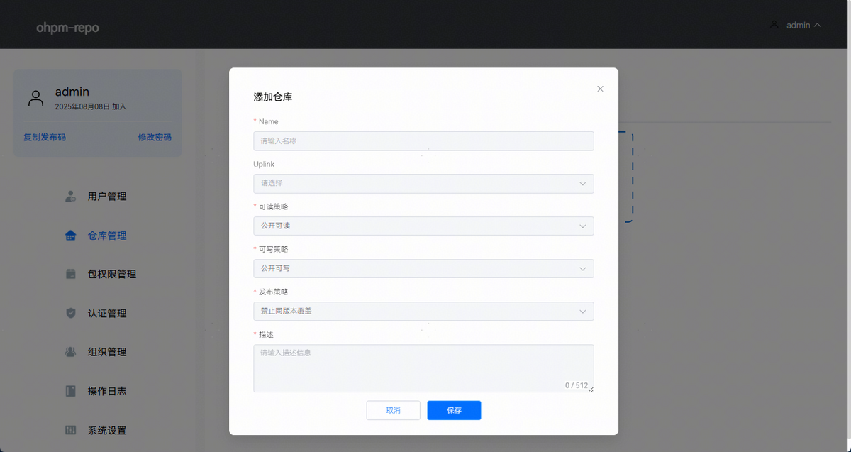 点击“+”图标按钮将新增一个仓库,可以对仓库的Name、Uplink、可读策略、可写策略、发布策略和描述信息进行编辑。可读策略默认为公开可读,可写策略默认为公开可写,发布策略默认为禁止同版本覆盖。最多支持创建20个仓库。