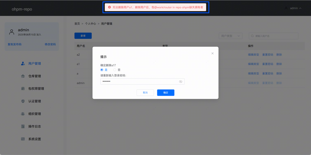 当被删除的用户是某个三方包的唯一所有者时,禁止被删除。