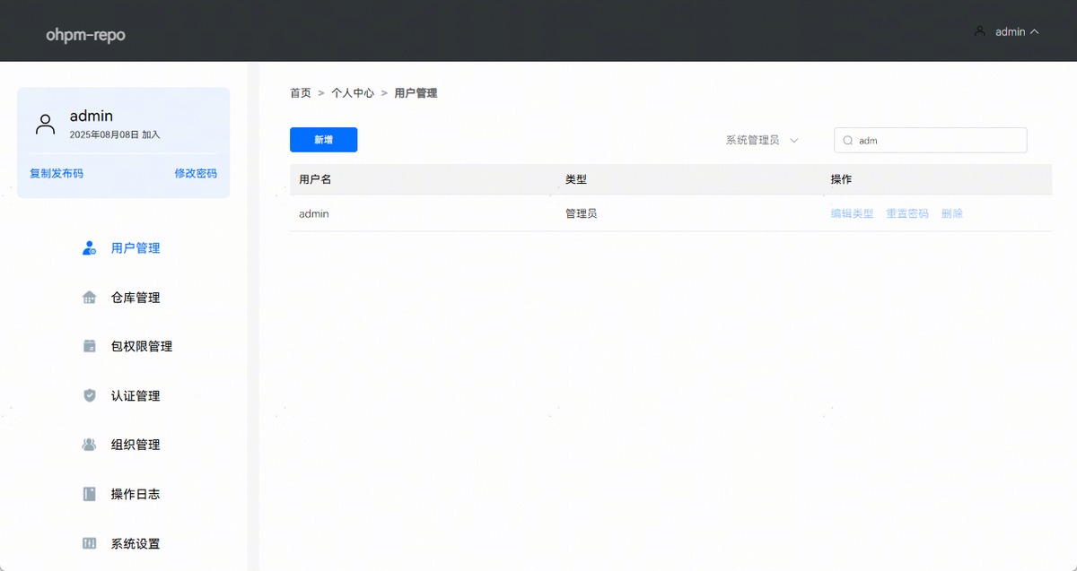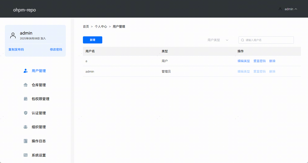 用户管理页面可以新增用户、修改用户类型、重置用户密码,删除用户和搜索用户,页面效果如下图所示: