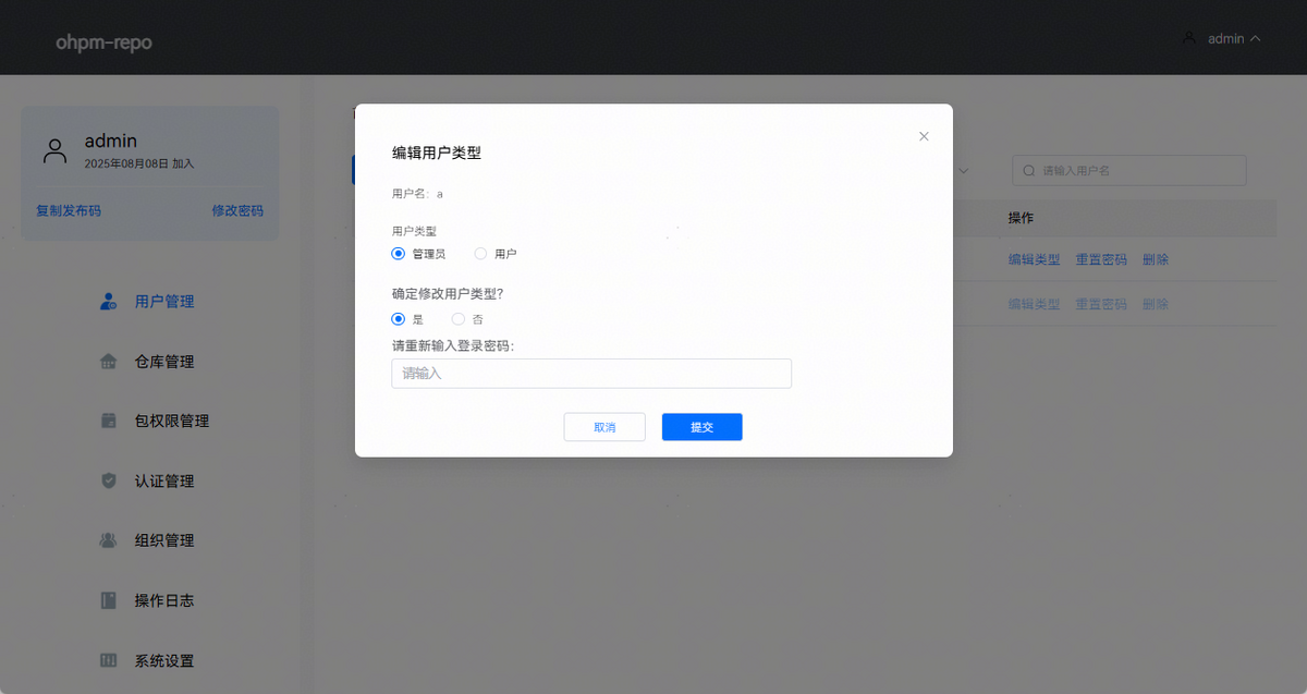点击“编辑类型”按钮,弹出编辑用户类型面板,在此面板中可以修改用户类型成管理员或用户。点击确认修改用户类型,将出现密码输入框,由于管理员修改其他用户的类型是敏感操作,故需要输入当前操作账户的密码进行再次验证,页面效果如下图所示: