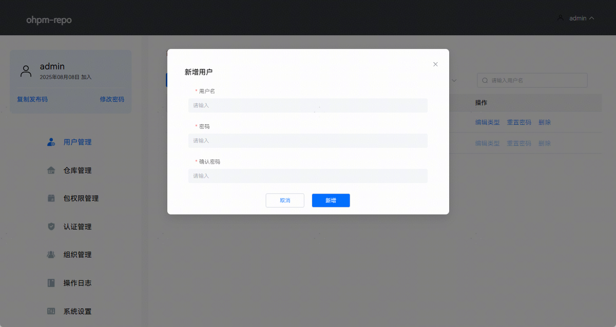 点击“新增”按钮,弹出新增用户面板,输入新增用户的用户名和密码,新增用户首次登录将强制重置密码。填完用户信息后点击新增即可添加一个新用户,页面效果如下图所示: