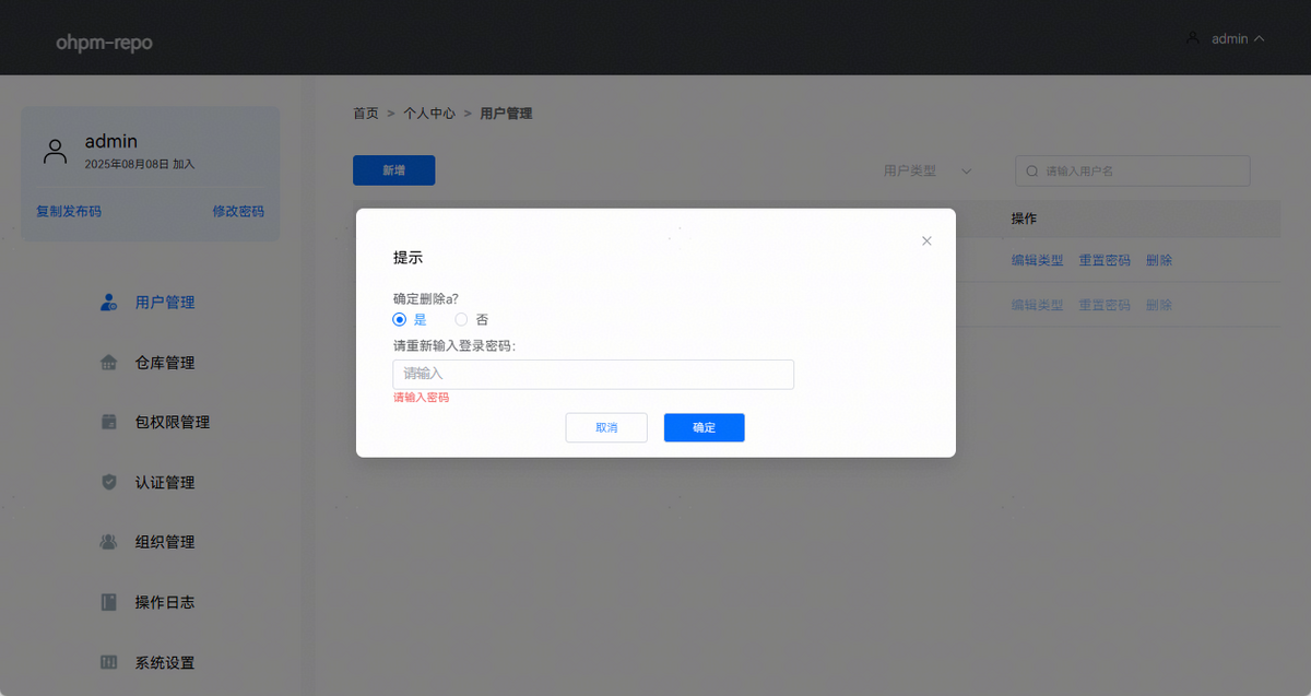 点击“删除”按钮,弹出删除提示,如果确定删除,需要点击按钮“是”,将出现密码输入框,由于管理员删除用户属于敏感操作,需要输入当前操作账户的密码进行再次验证,页面效果如下图所示: