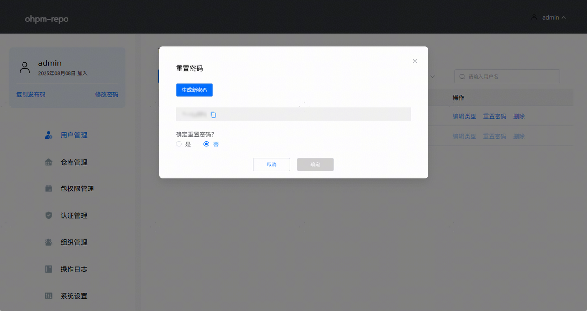 点击“重置密码”按钮,弹出重置用户密码面板,在此面板中可以通过点击生成新密码为用户生成随机新密码,并可通过点击复制图标将新密码复制进剪贴板(只有点击确定按钮才会重置密码)。点击确认重置密码,将出现密码输入框,由于管理员对其他用户重置密码是敏感操作,故需要输入当前操作账户的密码进行再次验证,页面效果如下图所示: