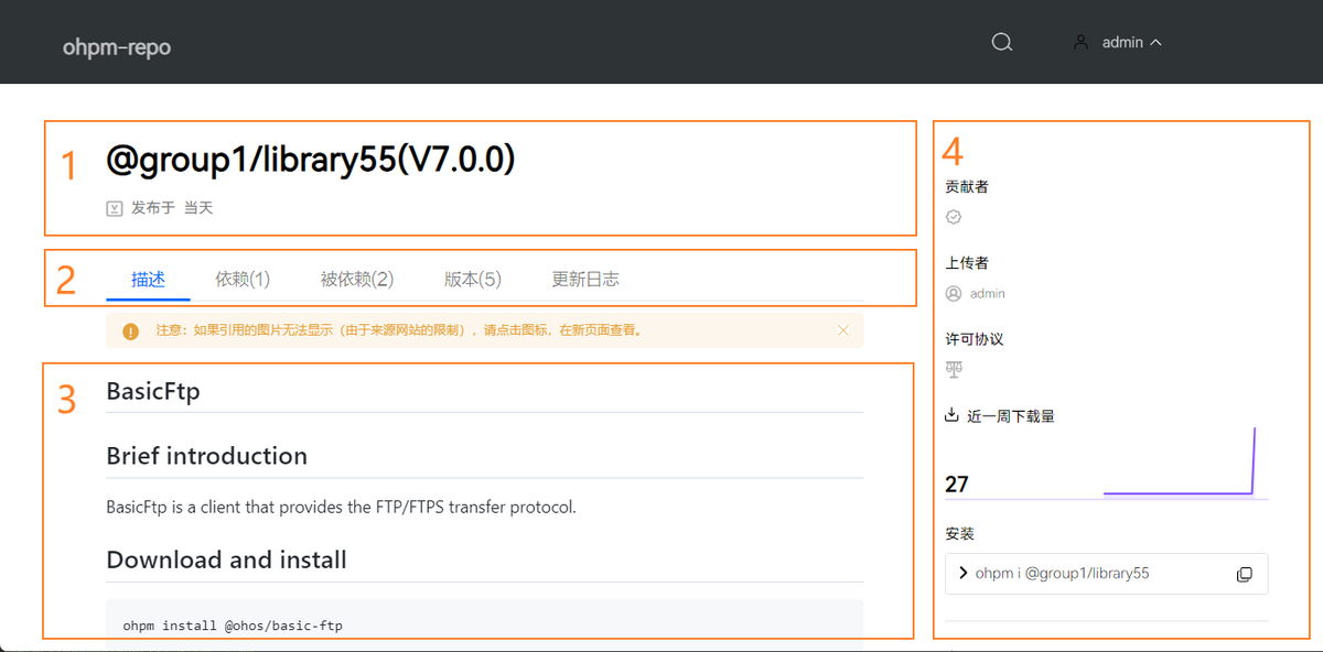 - 版本:记录包在ohpm-repo私仓中当前存在的所有版本与tag信息,点击版本列表可查看相应版本的包信息,同时包含不同版本包上传的时间和其近一周的下载量数据。