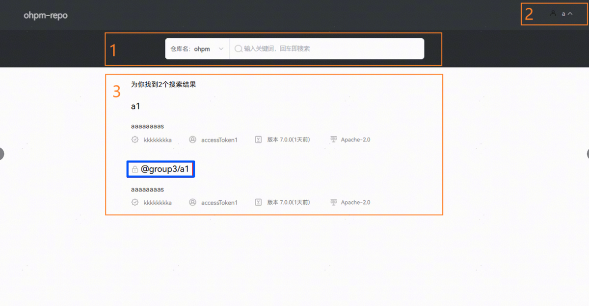 - 区域1:搜索区域,搜索功能采用两级筛选:先通过下拉菜单选择目标仓库,然后基于所选仓库进行包名的模糊查询。