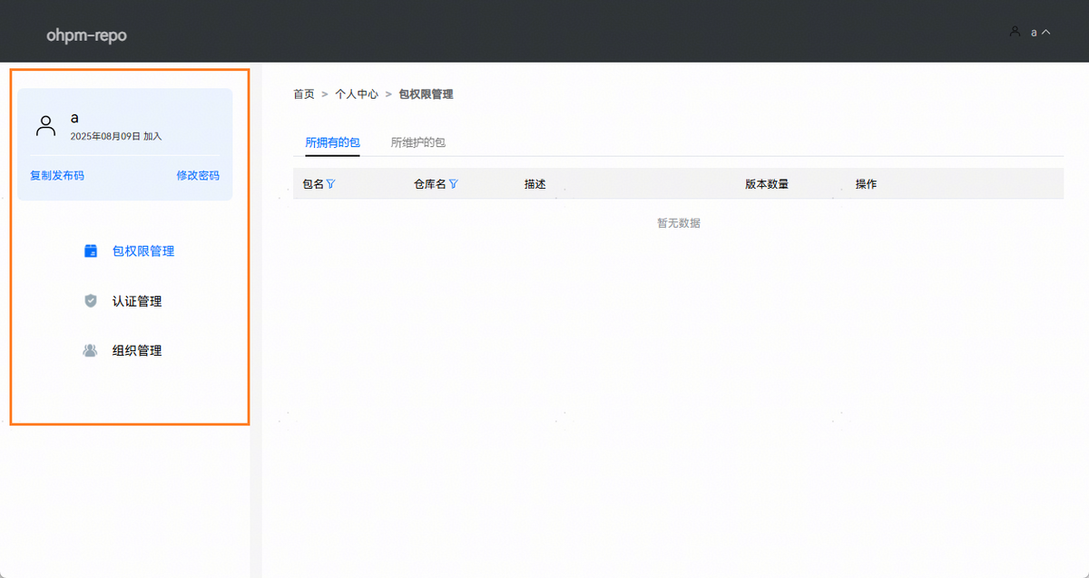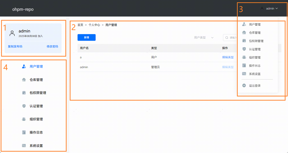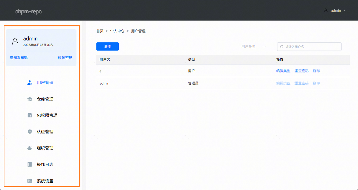 个人中心主页是ohpm-repo私仓的核心管理页面,整个系统在此进行集中管理和操作,页面效果如下图所示: