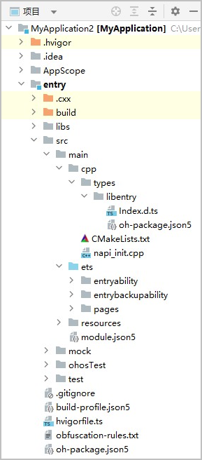 src > main > cpp > types > libentry> oh-package.json5:配置.so三方包声明文件的入口及包名。