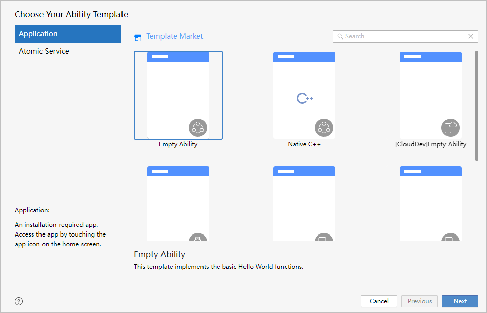 | Empty Ability | 用于Phone、Tablet、2in1、Car、Wearable、TV设备的模板,展示基础的Hello World功能。 |