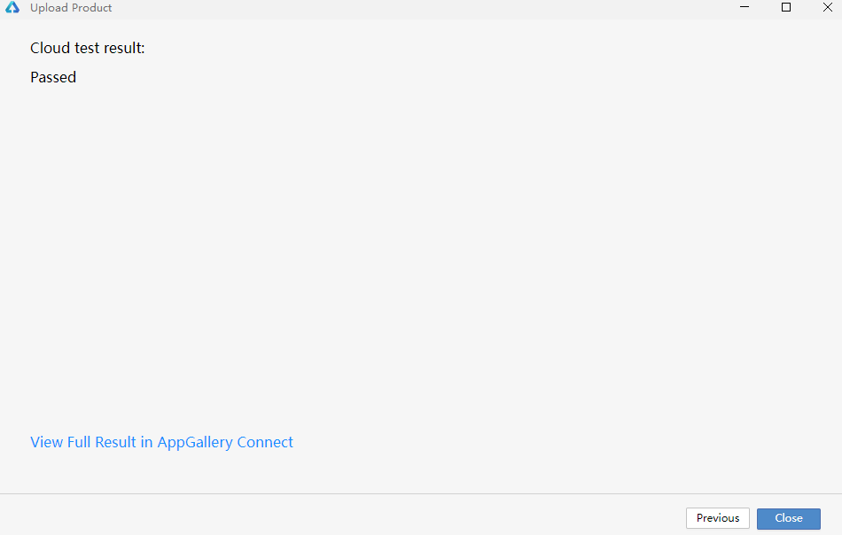 上传完成后,出现云测试的结果,点击View Full result in AppGallery Connect可进入AGC查看软件包上传记录和检测结果,具体请参考上传软件包。点击Close关闭上传页面。