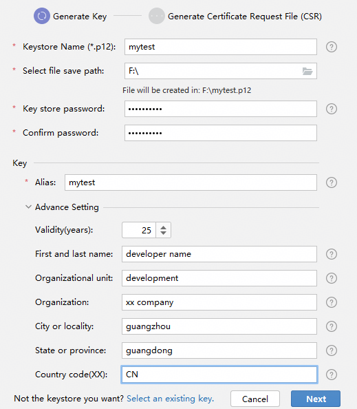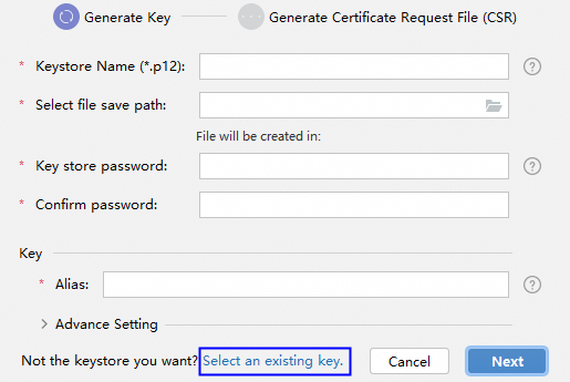 填写密钥库文件,若已有的密钥库文件(存储有密钥的.p12文件),单击Select an existing key进行选择。下面以新创建密钥库文件为例进行说明。