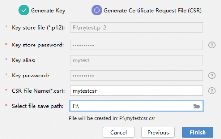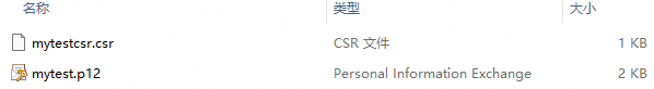 创建CSR文件成功,可以在存储路径下获取生成的密钥库文件(.p12)、证书请求文件(.csr)。