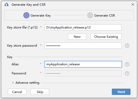 Advance Setting:密钥库文件的高级设置,选填。