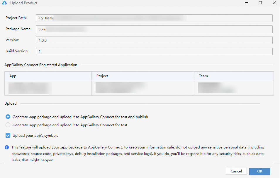 - 该功能将会把您的应用包传至App Gallery Connect用于测试或上架。为了您的信息安全,请勿上传带有个人敏感信息的数据(如密码、源代码、私钥、调试安装包、业务日志等信息)。