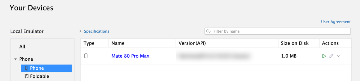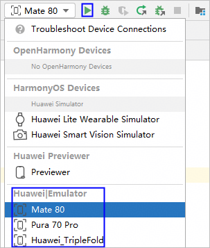 从DevEco Studio 6.1.0 Beta2版本开始,创建后的模拟器会展示在设备列表中(最多10个),选择模拟器后,点击运行按钮