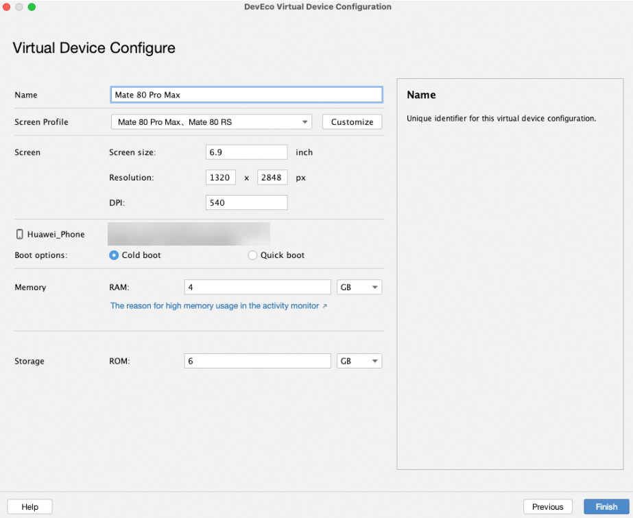 - Boot options:模拟器启动方式。从DevEco Studio 6.1.0 Beta1版本开始支持。