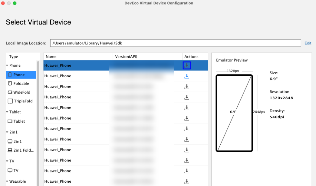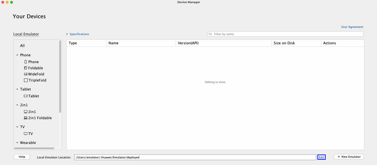 点击菜单栏的Tools > Device Manager,点击右下角的Edit设置模拟器实例的存储路径Local Emulator Location,Mac默认存储在~/.Huawei/Emulator/deployed下,Windows默认存储在C:\Users\xxx\AppData\Local\Huawei\Emulator\deployed下。