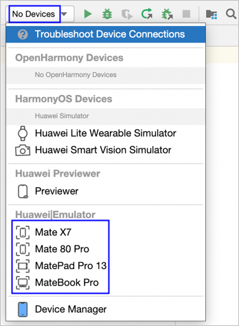 如果配置界面显示异常,例如设备列表为空等,可先关闭DevEco Studio,并进入~/Library/Huawei(Windows路径为C:\Users\xxx\AppData\Local\Huawei)目录,删除DevEcoStudiox.x文件夹(如DevEcoStudio6.0,具体文件夹名称和安装的DevEco Studio版本相关)以清理缓存。