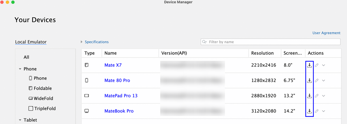 下载模拟器镜像,您也可以在该界面更新或删除不同设备的模拟器镜像。
