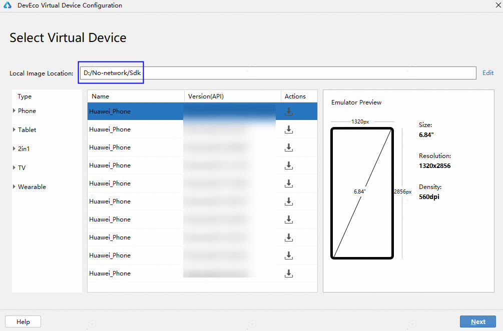 例如在Windows电脑下载手机镜像,并指定镜像下载路径为D:\Sdk,实际完整的镜像路径是D:\Sdk\system-image\HarmonyOS-xxx\phone_all_x86。