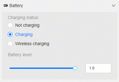 您可以通过仿真器模拟不同的电池状态,包括以下三种充电状态,也可以手动输入或拖动滑动条来改变电量大小。在应用中,您可以通过@system.battery模块查询仿真器的剩余电量以及充电状态。
