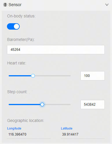 - ****Heart rate:****心率传感器用于测量心率数值,拖动滑动条,或直接输入心率大小。