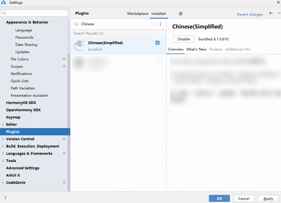 若使用DevEco Studio 6.0.0 Beta1以下版本,请在菜单栏进入File > Settings (macOS为DevEco Studio > Preferences )> Plugins,选择Installed页签,在搜索框输入“Chinese”,搜索结果里将出现Chinese(Simplified),在右侧单击Enable,点击OK,在弹窗中单击Restart,重启DevEco Studio后即可生效。