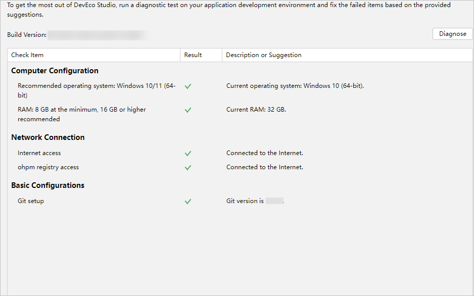 DevEco Studio开发环境诊断项包括电脑的配置、网络的连通情况、依赖的工具是否安装等。如果检测结果为未通过,请根据检查项的描述和修复建议进行处理。