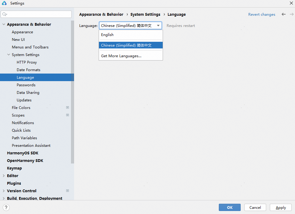 从DevEco Studio 6.0.0 Beta1版本开始,中文化插件默认启用。如需切换为中文显示效果,在菜单栏进入File > Settings...(macOS为DevEco Studio > Preferences/Settings ) > Appearance & Behavior > System Settings > Language,语言选择Chinese并点击Apply,在弹窗中点击Restart重启即可完成语言切换。若语言选择时未找到Chinese,请按照之前版本操作启用插件后,再选择。