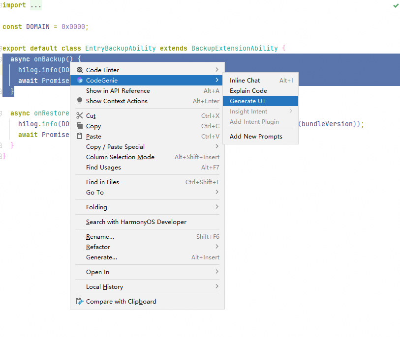 根据选中的ArkTS方法名称,CodeGenie支持自动生成对应单元测试用例,提升测试覆盖率。