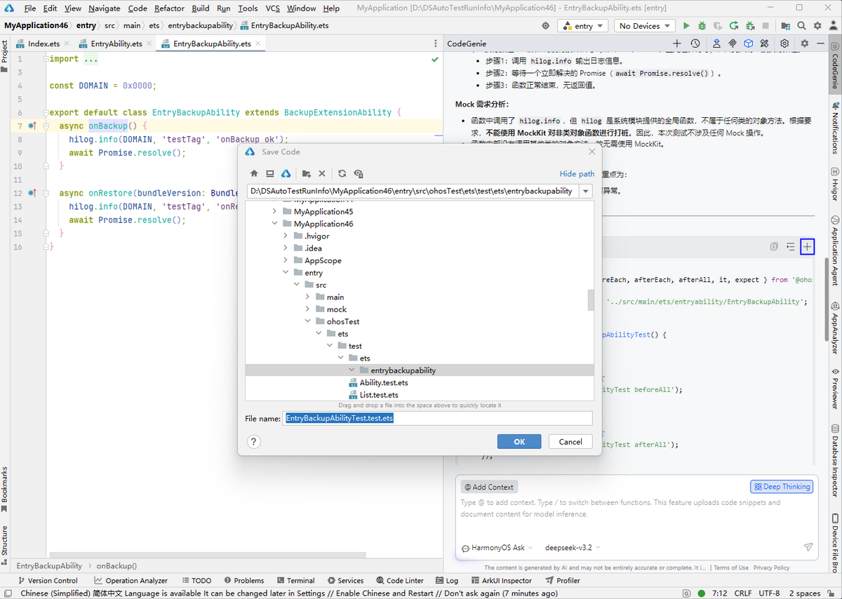 生成的单元测试用例文件被保存在待测函数所在模块下的ohosTest/ets/test目录,目录结构和待测函数保持一致。