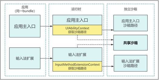 输入法扩展使用独立沙箱,与应用主入口不可互相访问对方的独立沙箱。