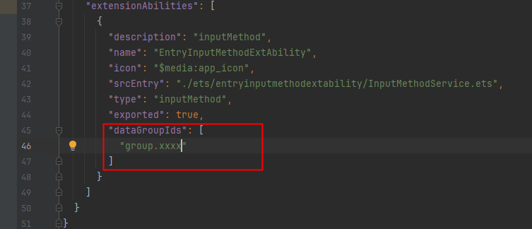 按照data-group-id申请成功的回复邮件指导,获取到您本次申请到的data-group-id,并在InputMethodExtensionAbility所在的module.json5中配置dataGroupIds。