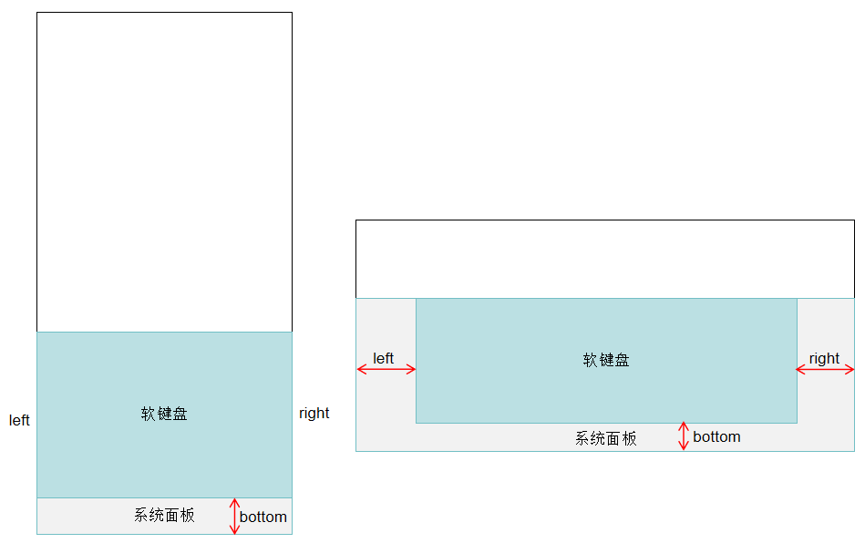 KeyboardController.ets文件。KeyboardController中除创建输入法窗口,设置输入法事件监听,实现文本插入、删除之外,还可以获取输入法键盘与系统面板的偏移区域,输入法系统面板在不同设备上存在差异,当设备有系统面板时,输入法软键盘相对系统面板的偏移区域如图所示:
