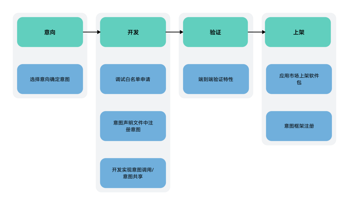 | 调试白名单申请 | 确定开发意向后,开发者发送邮件到邮箱(hagservice@huawei.com)或者联系华为意图框架接口同事,向华为提供测试应用的信息,用于申请调试白名单。 | 1. 应用名称:华为音乐。 2. 应用包名:com.xxxx。 3. 接入意图名称:“播放歌曲”。 4. 应用图标:jpg、png……。 5. APP ID:1234567。 6. Client ID:1234567。 7. 华为账号(UID):1234567、7654321……。 | 见各特性类型 习惯推荐:开发者测试 事件推荐:开发者测试 技能调用:开发者测试 |