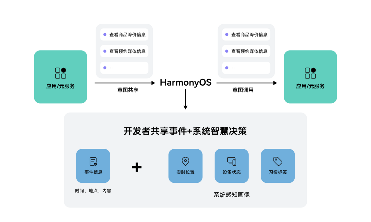 当开发者有事件想要通知到用户时,可通过应用/元服务的云侧服务器向智慧分发平台推送事件内容(意图共享)。系统通过智慧决策判断事件发生的条件,在满足条件时,向用户推荐事件提醒卡片,当用户点击卡片后,可跳转到应用/元服务的详情页查看事件详情(意图调用)。