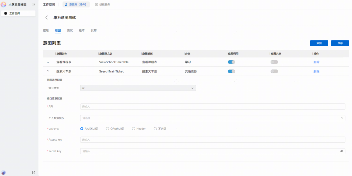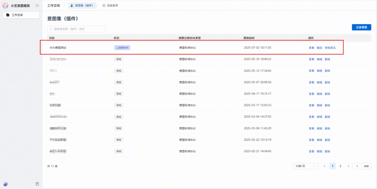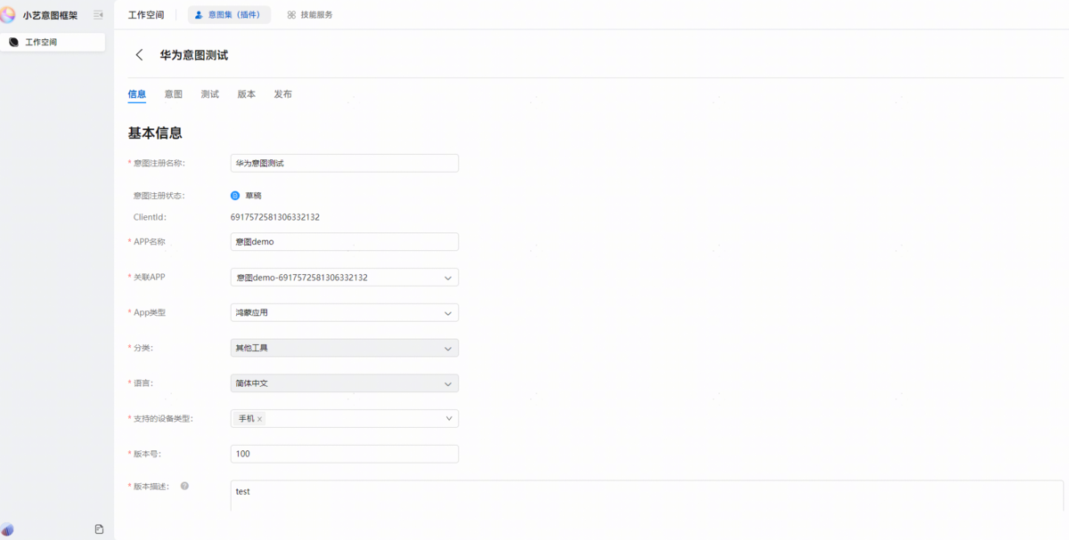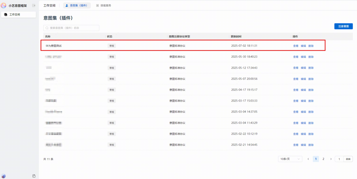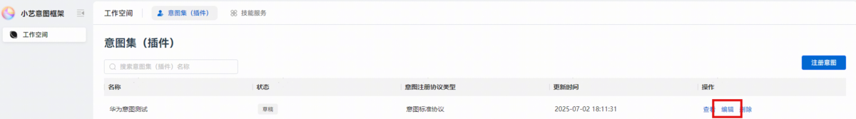 选择意图集:在“小艺开放平台”首页“意图集(插件)”中,携有意图声明文件的应用在AGC正式上架后可自动生成一条草稿态的记录,记录中包含开发者在意图配置文件中声明的所有端侧意图(云侧意图需手动新增,见下图)。