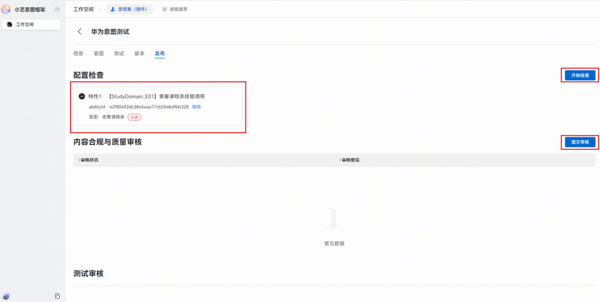 审核:提交审核后,在“小艺开放平台> 意图集中”,该条记录状态变为“上架审核中”,一般审核周期为3-5个工作日,审核通过后状态变为“已上架”,至此意图注册及特性选择已完成。