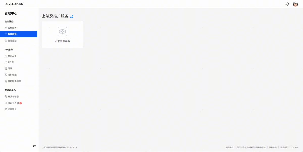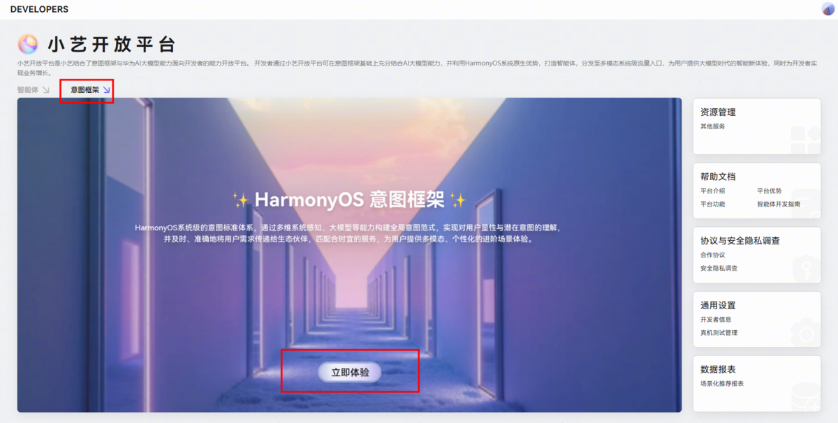 https://developer.huawei.com/consumer/cn/>> 管理中心 > 生态服务 > 智慧服务 > 小艺开放平台(原HarmonyOS服务开放平台) > 意图框架”,进入意图注册入口,需使用与应用上架相同的账号登录。