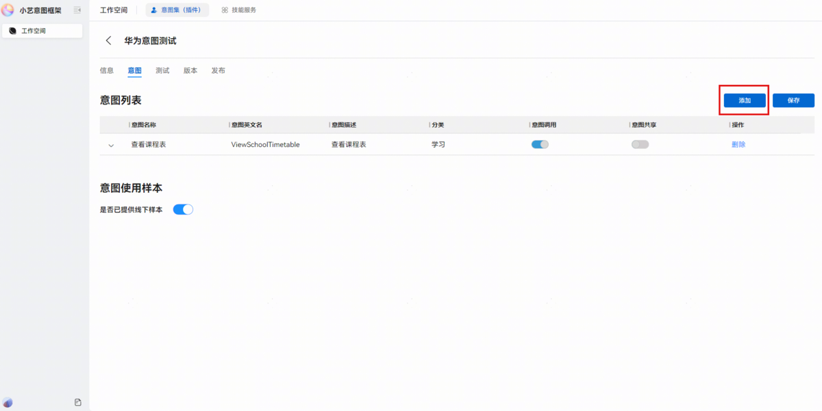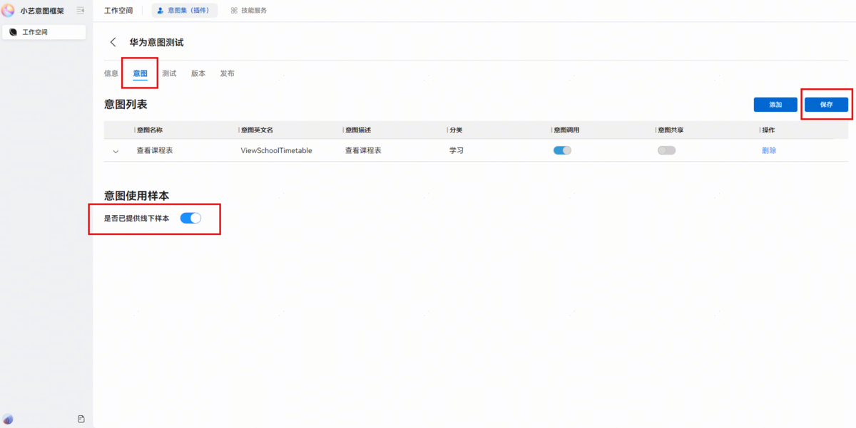 意图检查:切换至“意图”页签,点击“保存”会触发刷新,需检查接入特性所依赖的全量意图是否在此页面都已列出,同时打开意图使用样本中“是否已提供线下样本“开关。