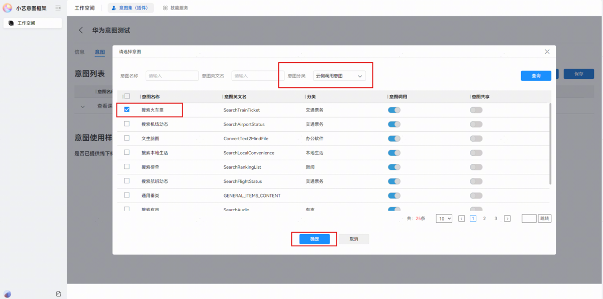 选择云侧意图分类,搜索意图名称,勾选所需意图进行添加(若没有找到对应意图可联系华为工程师,检查是否未配置该意图)。