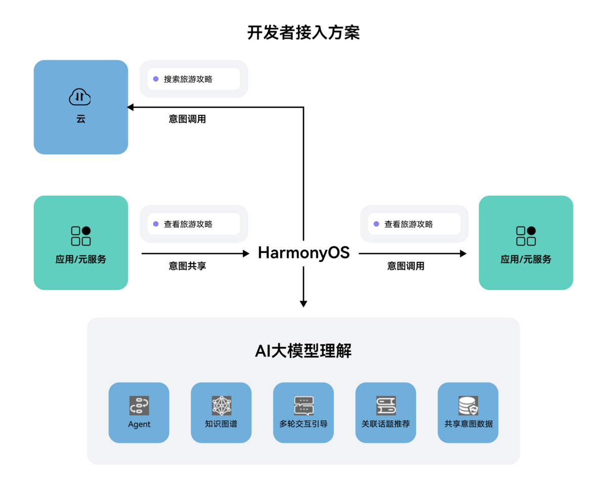 开发者需要按照意图定义,进行意图注册并实现意图调用;用户通过对小艺对话进行自然语言输入,小艺理解语义转换成意图调用(含意图参数),执行意图调用实现对应交互体验。
