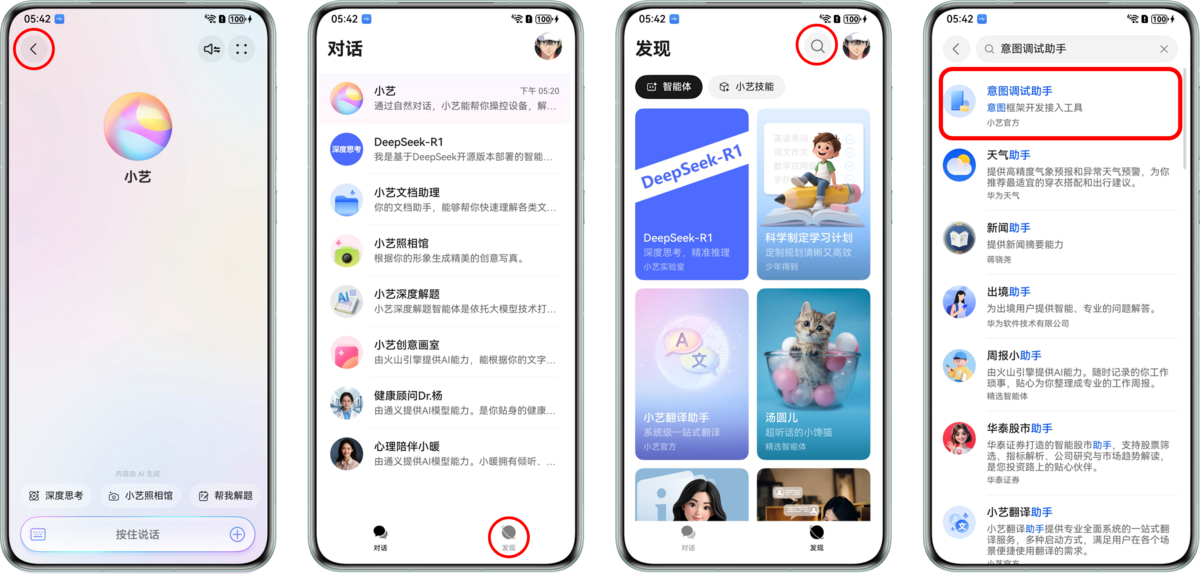打开意图调试助手:进入“小艺 > 返回主页面 > 发现”,搜索“意图调试助手”,点击进入意图调试助手。